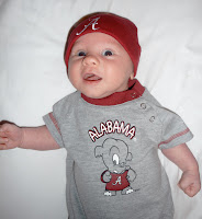 Monday was Braden's first day at Mrs Brenda's. He will be staying with her while mommy and daddy are at work. I have decided to go back to work 2 days per week until March. So that should give me practice getting Braden up and do everything I need to do to get to work on time. I will be going to work the days that Brad gets off at Hoover. So Braden will ride with me to work and Brad will swing by and get him and take him to Mrs Brenda's house for the day. It really was not that hard for me-I just felt like I was giving him to Brad to keep all day-Brad had the hard part-dropping him off. Braden got there around 8:30am -he went down for his nap around 10:30am and woke-up at 1:30pm. That is GREAT! He never naps that long at home! Brad picked him up around 3pm. Mrs Brenda keeps Cindi's boys and Jayce was at Mommy's Day out from 9-1pm so she really didn't have all the kids all day-but the test comes Thursday. Oh and by the way-I only texted her once to check on him. haha Here is a picture of Braden Monday morning at 6am-he is such a HAPPY BABY in the morning!!